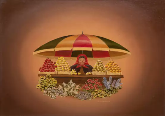 Lot 116  | Mosbacher, Helga (geb. 1940 in Hamburg) "Am Obststand", Öl/Platte, sign. u.r., 30x40 cm, Rahmen
