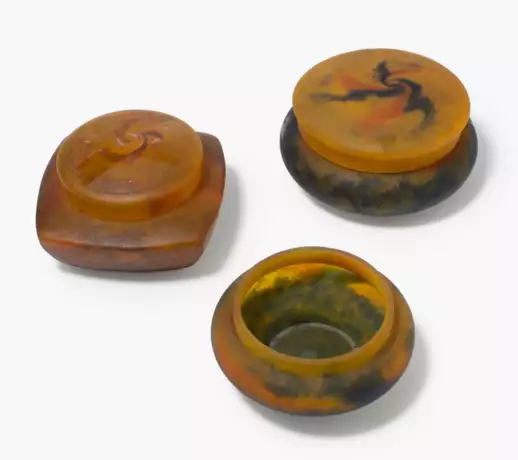 Lunéville, um 1925. Farbloses Glas mit mehrfarbigen Pulvereinschmelzungen. An der Wandung je signiert "MULLER FRES, LUNEVILLE" (blankgeätzt). D 12, 12,5 bzw. 14 cm.