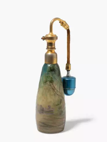 Lunéville, um 1920. Farbloses Glas, opakweiss unterfangen. Auf eisglasartig geätztem Grund hochgeätzter Landschaftsdekor. An der Wandung signiert "MULLER FRES, LUNÉVILLE" (Schwarzlot). Zerstäuber aus vergoldetem Weissmetall. H 26,5 cm.