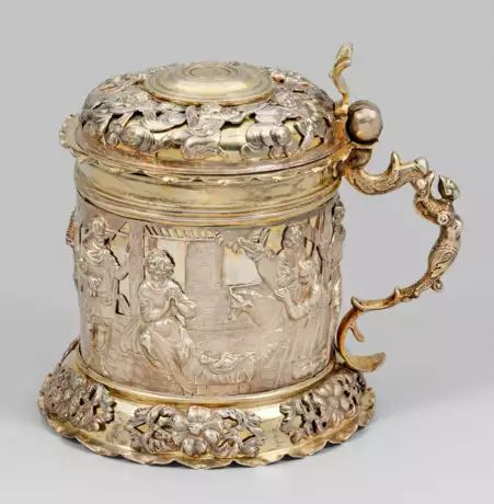 A rare Saxony-Anhalt parcel-gilt silver tankard with biblical embossed scene depicting the adoration of the Magi and the adoration of the Shepherds by August Hosse (1657-1732). City and master´s mark, date letter "E".