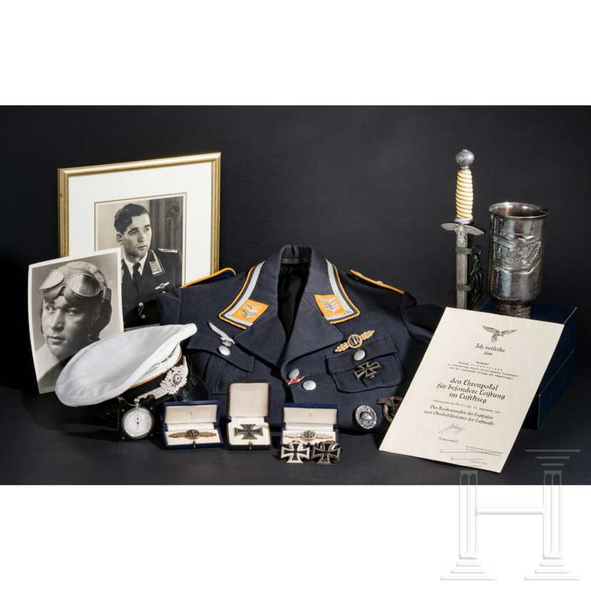 Besitzzeugnis zum Verwundetenabzeichen in Schwarz, 30.08.1942, OU Hauptmann Karl Kessel. Bestallung zum Unteroffizier, 27.10.1941, OU Major Erich Rathmann. Bestallung zum Oberfeldwebel, 01.06.1943, OU Major Karl Kessel. Glückwunschschreiben seiner Staffel zur Verleihung des Ehrenpokals, 15.10.1942. Luftwaffe-Soldbuch, komplett mit allen Seiten, bis auf das Flugzeugführerabzeichen sind alle Orden (ab 1941) eingetragen, die Seiten sind lose, das Foto auf der ersten Seite ist vorhanden. Seine Erkennungsmarke, diese nummerngleich mit dem Soldbuch. Weitere vier Militärausweise, alle mit Lichtbild. Fünf Flugbücher von 21.04.1939 bis 25.03.1945 mit insgesamt 1610 Flügen, davon 113 bestätigte Feindflüge. Im letzten Flugbuch hat er auch seine Flüge nach 1945 bis 18.06.1971 eingetragen.