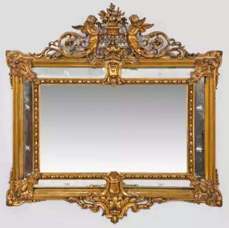 Holz, stuckiert und vergoldet. Querrechteckig angelegte, kissenartige, offen gestaltete und umlaufend profilierte Spiegelrahmung, durch Kartuschenmotive verbunden. Hohe, durchbrochen gestaltete Bekrönung aus zentralem Vasenmotiv, flankiert von plastischen Genien mit eingerollten Blattvoluten. Spiegelglas mit Altersspuren. 116 cm x 113 cm.