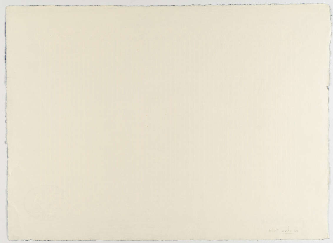 Leichte Knickspuren am rechten Rand, Blattkanten mit vereinzelten minimalen Einrisschen sowie schwach berieben. Mit einer winzigen weißen Anhaftung unten am linken Rand, kaum merklich. Insgesamt in gutem Zustand.