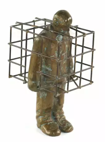 Zum Künstler: Siegfried Neuenhausen studierte von 1952 bis 1959 Malerei an der Kunstakademie Düsseldorf. Ab 1964 nahm er eine Lehrtätigkeit an der Hochschule für Bildende Künste Braunschweig wahr, seit 1968 ist er Mitherausgeber der Zeitschrift Kunst und Unterricht. Die Werke Neuenhausens zeigen gesellschaftliche Widersprüche, orientieren sich an Themen der Gesellschaftspolitik und nutzen Kunst zur Emanzipation des Menschen. Seine Darstellung wurde im Laufe seines Schaffens radikaler und politischer, so setzte er Figuren gefolterter und torsohafter Menschen in Kisten, auf Stühle, und heftete sie als Kleiderrest an Bretterwände. Neuenhausen inszenierte moralische Appelle, wie 1970 mit der Skulptur Mann in Kiste. Ihm geht es bei seiner Bildhauerei um gesellschaftspolitische Themen, die Entlarvung politischer Lügen und das Anprangern von Gewalt, Diktatur und Folter.