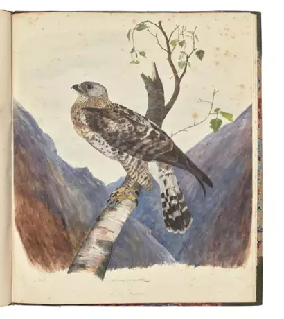 Fascinating collection of drawings of birds of prey by Alfred Newton, the first Professor of Zoology and Comparative Anatomy at Cambridge University, and the initiator of acts of Parliament for the preservation of birds. This set of drawings was executed by Newton when he was relatively young. He graduated from Magdalene College, Cambridge, with his BA in English in 1853, and then won election to the Drury travelling fellowship, allowing him ten years of ornithological study in places such as northern Scandinavia (1855) and Iceland (1858). He was often accompanied by his friend and fellow ornithologist, John Wolley (1823-1859). When Wolley died in 1859, he bequeathed his egg collection and notebooks to Newton who catalogued them in Ootheca wolleyana (1864-1907) before donating the collection to the British Museum. One of the smaller (non-raptor) drawings bound into this collection of Tringa temminckii (now Calidris temminckii, or Temminck's Stint) has the inscription on verso (probably in John Henry Gurney Jr’s hand) that states: ‘This picture was done by A. Newton from the parent of the first nest Wolley ever got, and the eggs the first that ever came to England – in 1853.’