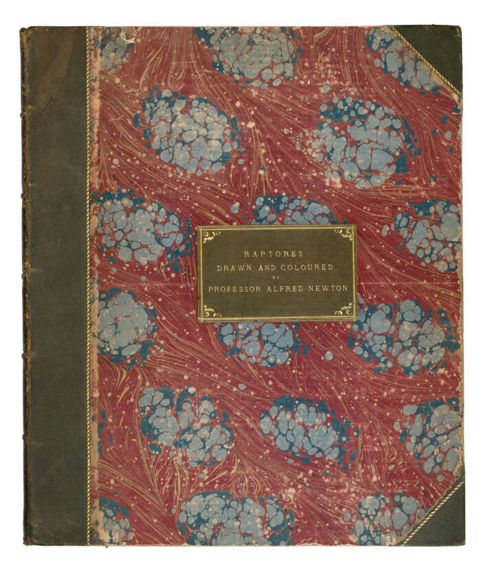 Large folio (525 x 435mm). 9 Large-format drawings of birds of prey by Newton, all but one with scale at foot, 4 dated 1854 with initialled monogram ‘AN’, one dated 1856-1859, 7 numbered in pencil but bound out of sequence, all but one captioned in pencil with occasional notes on scale, bound with three much smaller drawings of other birds by Newton, 2 of which dated 1854 with initialled monogram ‘AN’, and with manuscript notes by Newton and Gurney on versos (some captions trimmed by the binder, variable spotting throughout). Contemporary olive-green half morocco over marbled-paper covered boards, olive-green morocco gilt lettering piece to upper cover (extremities rubbed). Provenance: John Henry Gurney Jr (1848-1922, ornithologist; bookplate and piece of paper loosely inserted with Gurney’s autograph signature).