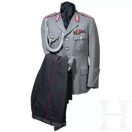 Bundeswehr, Uniform bestehend aus Hose, Jacke und Krawatte für einen Oberstleutnant der Panzertruppe. Ein handgeschriebener Brief vom General der Panzertruppe a.D. Nikolaus von Vormann an Norbert Kujacinski, datiert 18. Mai 1959. Grabschleife der Ordensgemeinschaft der Ritterkreuzträger sowie vom Bundesminister für Verteidigung, Kujacinski starb am 2. Mai 2009. Seine Bandspange, 1957er-Ausführung. Ein Ordner mit Urkunden für das Deutsche Sportabzeichen. Beförderung zum Major der Reserve, datiert 13.02.1968, signiert von Oberstleutnant Brehde. 15 Fotos, aufgenommen nach 1945, dabei Fotos vom Bundestreffen der Veteranen des Panzer-Regiments 23. Desweiteren Reprofotos aus der Kriegszeit, einige Foto-Negative und weitere Dokumente. Alters- und Gebrauchsspuren.