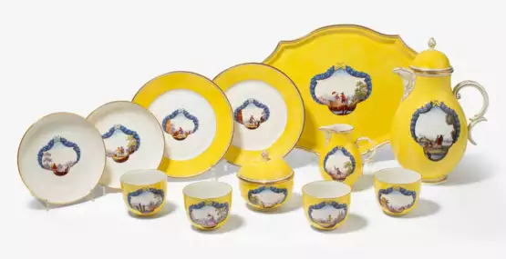 20.Jh. Porzellan. Gelber Fond. Schauseite mit Figuren vor Landschaftskulisse. Umrandung mit stilisierten dunkelblauen Blumengirlanden. Goldstaffierung. Bestand: 1 Mokkakanne, 1 Crémier, 1 Zuckerdose, 6 Mokkatassen mit Untertassen (H 5 cm), 6 Dessertteller (D 19 cm), 1 Tablett. Total 16 Teile.