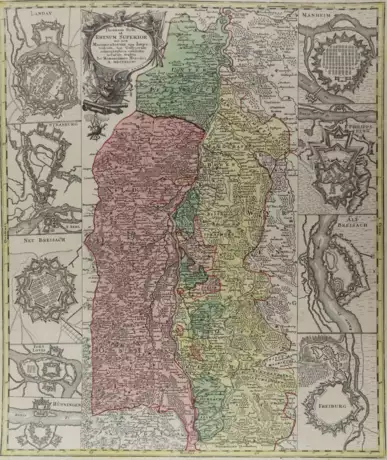 ╔Dabei: Rheinlauf.╗ Theatrum Belli ad Rhenum Superior... Rheinlauf von Zurzach bis Mannheim. Kolor. Kupferstichkarte bei Homann Erben, Nbg. 1734. 55,5 x 46,5 cm. Mit emblemat. Titelkart u. seitl. 9 Grundrissplänen (Landau, Straßburg, Breisach, Mannheim, Freiburg etc.). Hinter Passep. mont. - 1 kl. Löchlein unt. knapp an der Einfassung. Zus. 2 Bl.