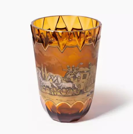Haida, um 1935. Bernsteinfarbenes Glas mit Zierschliff. Schwarzlotmalerei auf Goldgrund. Malersignaturen. H 21 cm bzw. 14,5 cm.