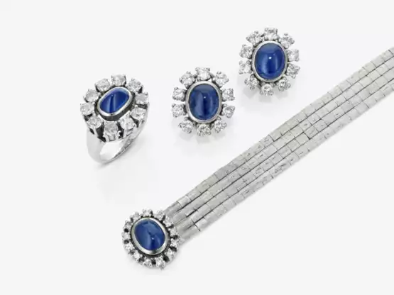 585 white gold. 43 brilliant-cut diamonds, totalling approx. 3.66 ct. 4 sapphire cabochons. Bracelet length: 18.5 cm. Ringsize: 50. Ca. 44.5 g.