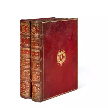 2 vol. in-4 (237 x 172 mm). Édition originale (quelques mouillures marginales et cahiers brunis, restaurations marginales au verso d'un feuillet). Reliure de l’époque : maroquin rouge, armes de Jean-Baptiste Colbert au centre des plats, triple filet doré en encadrement, dos à nerfs, caissons ornés aux petits fers, notamment du chiffre couronné de Colbert ainsi que des couleuvres provenant de ses armes parlantes, roulette dorée sur les coupes, tranches jaspées (coiffes refaites, quelques discrètes restaurations, traces de mouillures sur les plats).