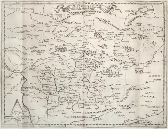 Brunet IV, 233. Lipperheide Gb 15. Erste lat. Ausgabe, eine franz. war 1615 vorausgegangen. - Behandelt die hessischen, die saarbrücker und die niederländischen Linien des Hauses Nassau mit schönen Porträts, Brustbilder im Oval. Die Nassau-Karte von P. Bertig in der Begrenzung Siegen-Battenberg / Eder - Hanau - Frankfurt - Simmern - Rhein. - Gutes Exemplar.