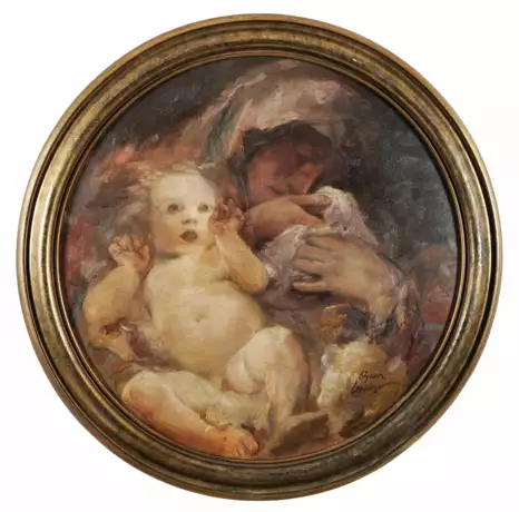 Der österreichische Historien- und Genremaler und Absolvent der Wiener Kunstakademie griff in seiner Kunst überwiegend biblische und mythologische Themen auf. Die vorliegende Mutter-Kind-Darstellung im Tondo-Format entzieht sich einer eindeutigen ikonografischen Bestimmung; sie kann sowohl christlich, historisch-mythologisch oder allgemein menschlich interpretiert werden. Öl/Holz. R. u. sign. D. ca. 58 cm. Rahmen.