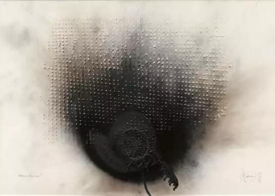 Notation: Titled, signed and dated lower left and right: "Pattern Cluster" Piene (circled) 57-86-91.