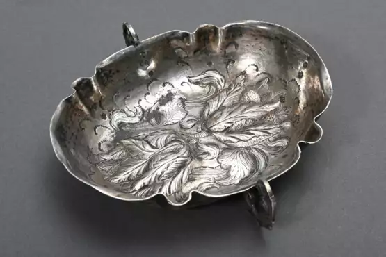 Oval brandy bowl with wavy sides and embossed motif ‘Two Tulips’ in the centre, probably Holland 17th/18th century, unknown maker’s mark: H., silver, 83g, 12.6x13cm