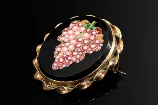Oval doublé pin with fine micro mosaic ‘grape’ on black plate, circa 1860/1870, 16.3g, 4.2x3.5cm