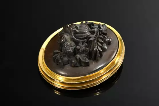 Oval yellow gold 750 pendant pin with late Biedermeier horn carving ‘Flower Bouquet’, 31g, 4.8x4.1cm, chips and missing pieces