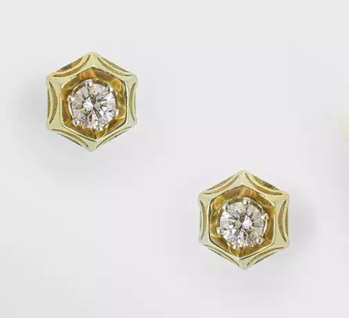 Gelbgold, gest. 585. Zentral besetzt mit zwei Altschliffdiamanten von zus. ca. 0,70 ct.; Ges. Gew. ca. 4,39 g.
