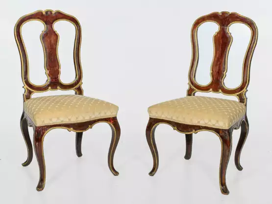 Buchenholz, rotbraun, gebeizt und teilw. vergoldet. Trapezförmige, passig geschweifte Zarge auf geschwungenen Beinen. Schildförmige, durchbrochen gearbeitete Rückenlehne mit balusterförmigem Mittelsteg. Sitzfläche gepolstert und bezogen. Sitz-H. 43 cm.