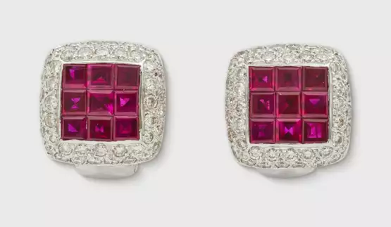 Weißgold, gest. 750. Zentral besetzt mit taubenblutroten Rubin-Carrées von zus. ca. 0,90 ct. in sog. "Invisible Setting", entouriert von Brillanten von zus. ca. 0,40 ct.; Ges.-Gew. ca. 7,83 g.