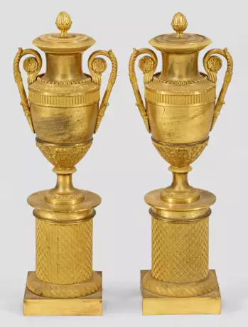 1-flg.; Bronze, vergoldet. Über quadratischer Plinthe zylinderförmiger Schaft, umlaufend mit fein reliefiertem Blütendekor im Rapport. Oberhalb balusterförmige Vase mit erhaben reliefiertem Akanthusblatt, schmalem, godronierten Lippenrand sowie seitlich gestreckten Henkeln aus eingerollten Voluten. Flacher oberer Abschluss mit Pinienknauf bzw. zylinderförmige Tülle. H. 28 cm.