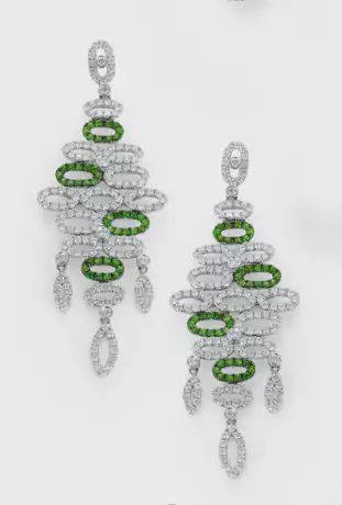 Pair of earrings set wih diamonds approx. 4,47 ct. (H/vvs) and green garnets approxx. 1,30 ct., in 18 k white gold.