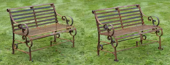 Eisen mit Rostpatina. Schmale, durchbrochen gearbeitete Seitenwangen aus eingerollten Voluten. Geschweifte Sitz- und Lehnenfläche aus schmalen Stegen. H. 89 cm. 109 cm x 73 cm. Sitz-H. 45 cm.