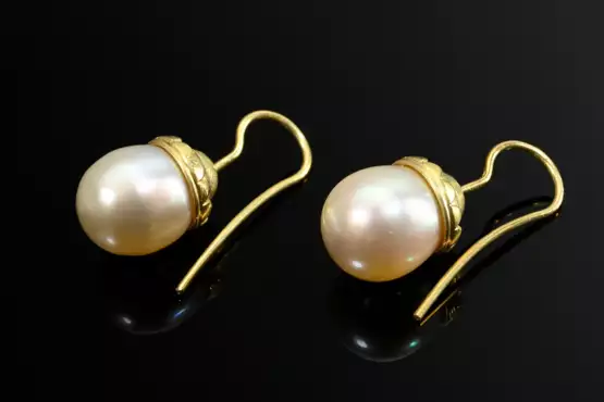 Pair of 750 yellow gold drop earrings with cultured pearls, goldsmiths Mutabor, Frank Kutzick, Hamburg, 8.1g, L. 2.7cm, Ø 11mm