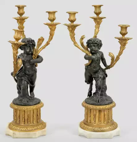 Gegenstücke. 3-flg.; Bronze, teilw. dunkel patiniert und Marmor. Über flacher Sockelplatte kannelierter Säulenstumpf mit Palmettenfries. Oberhalb vollplastisch gestaltete Puttenkinder als Träger für Leuchtmittel aus stark geschwungenen, blattreliefierten Leuchterarmen mit vasenförmigen Tüllen. H. 63 cm.