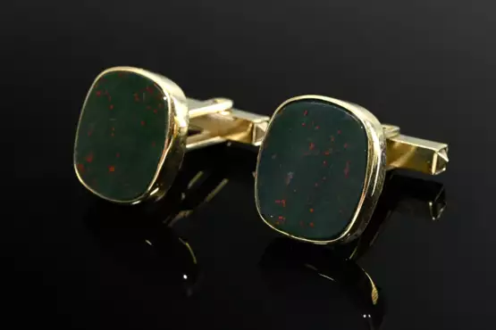 Pair of classic 585 yellow gold cufflinks with heliotrope plate and toggle, 12g, 1.7x1.6cm