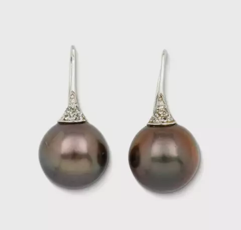 Pair of earrings set with Tahiti pearls approx. 13 mm (small inclusions) and small diamonds, in 14 k white gold