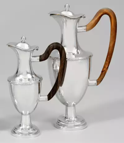 Silber. Auf rundem Fuß ovoider Korpus mit eingezogenem Hals und mittig aufgewölbtem Scharnierdeckel mit doppelt profiliertem Balusterknauf. Schulter und Rand mit Lorbeer- bzw. Perlstabdekor umzogen. Rückseitiger Schwanenhals-Henkel aus Holz. Innen vergoldet. Ein Henkel rep.; Gest., Beschauzeichen, Meister Johann Andreas Dressel (wird Meister 1784). Gew. zus. ca. 1375 g. H. 24,5 cm - 30 cm.