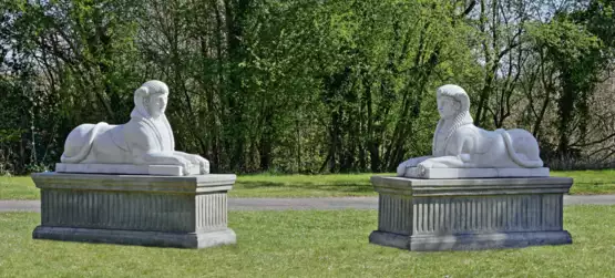 Gegenstücke. Weißer, leicht hellgrau geäderter Marmor. Repräsentative, neoklassizistische Park- bzw. Gartenskulpturen. Auf rechteckigen, vorne abgesetzten Plinthen ruhende, vollplastisch ausgeführte Sphingen mit subtiler Oberflächenbehandlung. Die weiblichen Köpfe mit langen, geflochtenen Zöpfen und Kopfschmuck, der Körper und der Schweif in Löwenform. Rechteckige, hellgraue Guss-Steinsockel mit abgesetzter Basis und Deckplatte, sowie kannelierten Seiten. Sphingen ca. 89 cm x 150 cm x 54 cm; Sockel ca. 68 cm x 190 cm x 71 cm.