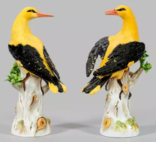 Auf hohem, mit plastischen Blättern belegtem Stamm sitzender Pirol mit angelegten bzw. ausgebreiteten Flügeln. Naturalistisch reliefiertes, schwarz-grau und gelb staffiertes Gefieder. Polychrome Malerei mit Goldstaffage. Entw. Johann Joachim Kaendler und Johann Gottlieb Ehder. Modell-Nr. 820 und 820 X. Rest.; Schwertermarke. H. 25,5 cm - 26 cm.