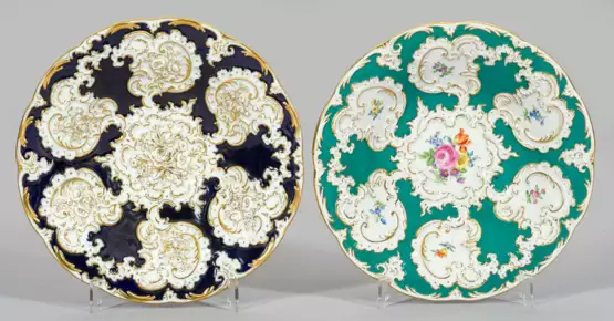 Runde, leicht vertiefte Form mit passig geschweiftem Rand. In kobaltblauem bzw. russisch grünem Fond auf Spiegel und Fahne Rocaillekartuschen mit farbigen sowie in Gold reliefierten Blumengebinden bzw. Blütenzweigen. Polychrome Malerei mit Goldstaffage. Entw. Ernst August Leuteritz. Modell-Nr. C 139 und 54109. Schwertermarke. D. 28,5 cm - 29 cm.