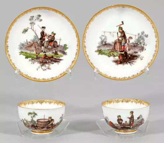 auf Unterschalen. Über dem Rundstand halbkugelig gewölbter Korpus mit Ohrhenkel. Schauseitig der Wandung und im Spiegel großflächige, verschiedene szenische Darstellungen aus dem Arbeitsleben von sächsischen Bergleuten. In baumbestandener Felslandschaft Bergmänner beim Reinigen von Erz, Gestein und Gold bzw. beim Hacken von Holz sowie ein Junge, seine Notdurft verrichtend. Blüten im Tassenboden. Feine polychrome Malerei, wohl von Gottlieb Bonaventura Häuer. Goldspitzenbordüre. Goldmaler-Buchstabe "S". Pressnr.; Gold teilw. minim. erg.; Minim. best./ber.; Schwertermarke. Tassen-H. 4,5 cm. Untertassen-D. 12 cm.