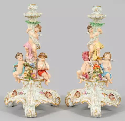 Gegenstücke. Dreibeiniger, rocailleförmig geschweifter Fuß mit Akanthus- und Muschelreliefs. Darüber aus naturalistischem Terrain aufsteigender, mit reliefplastischen Blättern und Blüten umzogener Schaft mit drei Amorknaben, die Jahreszeiten symbolisierend. Putten mit Schreibtafel und Kranz als Frühling und Sommer bzw. Fackelträger mit Umhang und Trompeter als Herbst und Winter. Feine polychrome Malerei mit Goldstaffage. Entw. Paul Helmig, 1882 - 1885. Modell-Nr. N 168 und N 169. Rest.; Minim. best.; Schwertermarke. Leuchter-H. 40 cm.