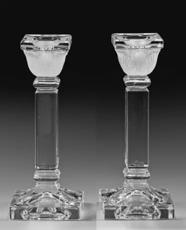 in klassizistischer Säulenform mit Akanthuskapitell als Tülle. Poliertes Kristallglas, partiell satiniert. Hersteller- oder Vertriebsetikett "FK". H. 23,5 cm.