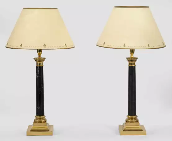 1-flg.; Messing und anthrazitfarbener Marmor. Über gestuftansteigender Sockelplatte konischer Säulenschaft als Träger für Leuchtmittel. Konischer Lampenschirm. Elektrifiziert. H. 75 cm.