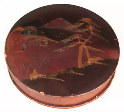 Lot 552 | Pappmaché-Schachtel, rund, Japan, braun mit Landschaftsdarstellung, Gebrauchspuren, H. 3 cm, Dm. 15,5 cm