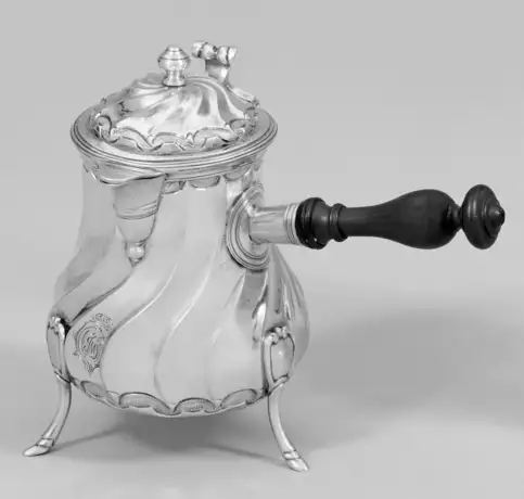Silber. Auf drei ausgestellten, in kleinen Hufen endenden Beinen birnförmiger Korpus mit senkrechten, gedrehten Zügen, hoch angesetztem Konsolausguss und seitlicher Handhabe aus ebonisiertem Holz. Scharnierdeckel leicht aufgewölbt mit mittigem Knauf. Ränder mit fein punzierten Wellenbändern umzogen. Schauseitig kleine Kartusche, lig. monogr.; Gest. Beschauzeichen, undeutliches Meisterzeichen. Ges.-Gew. 170 g. H. 11 cm.