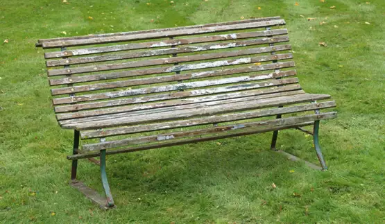 Eisen, lackiert und Holz mit starker Witterungspatina. Durchbrochen gearbeitete Seitenwangen aus schmalen Streben. Geschweifte Sitz- und Lehnenfläche aus dicht angeordneten, gekanteten Stegen. H. 86 cm. 158 cm x 78 cm. Sitz-H. 44 cm.