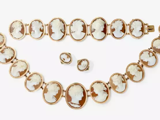 Lot 78 | A parure consisting of a necklace, bracelet, and two rings with shell cameos