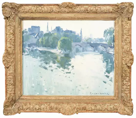 In der koloristisch subtil abgestimmten Paris-Ansicht mit der Pont de la Cité im Hintergrund brachte Anderbouhr seine Bewunderung für sein großes Vorbild Claude Monet zum Ausdruck. Als Spätimpressionist erlangte er große Bekanntheit und stellte seit 1939 im Pariser Herbstsalon, im Salon des Artistes Français und in der berühmten Galerie Durand-Ruel aus. Öl/Lwd.; R. u. sign.; 46 cm x 55 cm. Rahmen.