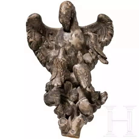 Vollplastische und vollflächig versilberte Figur aus Holz. Oberhalb eines stilisierten Baumstammes mit verbreiterter Laubkrone sitzt ein Pelikan, mit ausgebreiteten Flügeln seinen Nachwuchs beschützend. Mit dem Schnabel bohrt er sich eine Wunde in die Brust, um mit eigenem Blut die hungernden Jungen ernähren zu können. Die drei Kleinen angesetzt gearbeitet und daher leicht gelockert. Fassung mit Abplatzungen, etwas berieben. Höhe 50 cm.