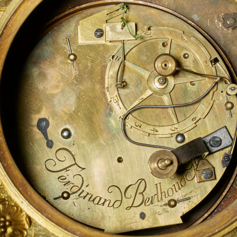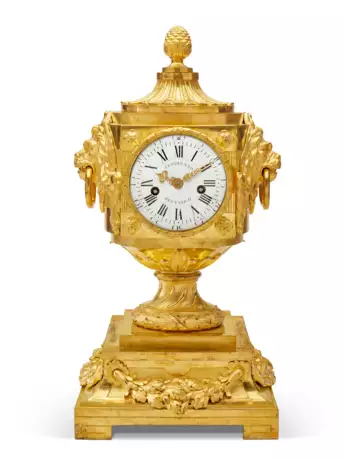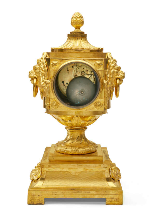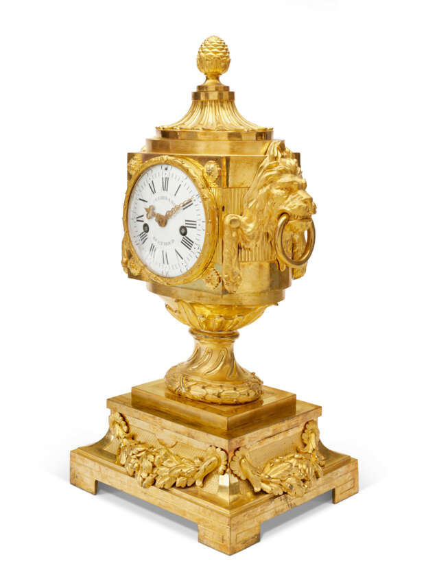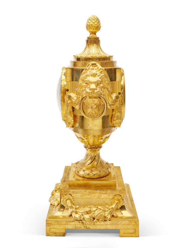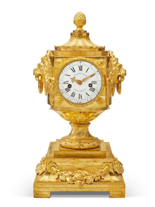 En bronze ciselé et doré, le cadran circulaire émaillé signé 'FERDINAND / BERTHOUD' inscrit dans une caisse en forme d'urne surmontée d'une pomme de pin et flanquée de masques de lion retenant des anneaux tombant dans leur gueule, le piédouche à cannelures torses et ceint d'une frise de laurier, le socle étagé ceint de guirlande de feuilles de chêne et de glands, la base signée 'OSMOND' le mouvement signé 'Ferdinand Berthoud AParis' et inscrit 'FOUNÈS' à l'encre sur le timbre