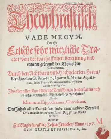 VD 16, P 1319. - Erste dt. Ausgabe. Die lat. EA ersch. 1594. Der franz. Alchemist und Arzt Bernard Georges Penot (1519-1617) suchte unter anderem nach dem Stein der Weisen als Mittel zum Goldmachen und universeller Arznei. Er korrespondierte mit verschiedenen Gelehrten seiner Zeit wie zum Beispiel Jakob Zwinger (1569-1610) oder Andreas Libavius (1555-1616) und arbeitete in verschiedenen Krankenhäusern. - Teils in der Bindung gelockert und Innenstege offen, papierbedingt gebräunt, etwas stock-, finger- und feuchtfleckig und mit Randläsuren. Block vom Rücken und RDeckel gelöst. Deckel mit Besitzstempel und gebrochenem Besitzsiegel d. Zt. (mit großer Fehlstelle). Vorsatz mit zwei Exlibris "Dr. Jur. Paul Muno" und "Nicolaus Muno Weingutbesitzer Lorch i. Rheingau".