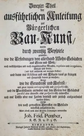Ornamentstichsammlung 2012-13. Vgl. UCBA II, 1571 sowie Architekt und Ingenieur 120/143. - Umfassendes Werk, das ursprünglich auf acht Bände angelegt war. Die vier Werke von Johann Friedrich Penther (1693-1749) handeln von Monumentalarchitektur, der deutschen, franz. u. italienischen Baukunst sowie mit dem Bau von Kapellen, Kanzleien, Marstallen, Bibliotheken, Kunst-Kammern, Rathäusern etc. "Der Wert des Werkes liegt in seinen praktischen Angaben. Sein Begriff von 'bürgerlicher Baukunst' umfasst alle Bauaufgaben, und so finden sich in seinen Tafeln zahlreiche Darstellungen zeitgenössischer deutscher Schlossarchitektur" (Kruft). - Es fehlen 121 Kupferstiche (wohl aus Band III). Vorsätze leicht leimschattig. Band I: Titel mit großem Fehlstück (großer Textverlust) sowie teils stärker stock- und fingerfleckig. Band II: Vorderes Innegelenk offen. Stock- und fingerfleckig, mit Knickspuren, Randläsuren und vereinzelt mit winzigen Feuchtflecken. Band III: Innengelenke vereinzelt geöffnet, teils mit einem leichten Feuchtrand am Fußsteg. Band IV: Titel mit kleinem Einriß, teils leicht braun- und fingerfleckig, die letzten Blätter am Rand etwas angestaubt und leicht schimmelsporig.