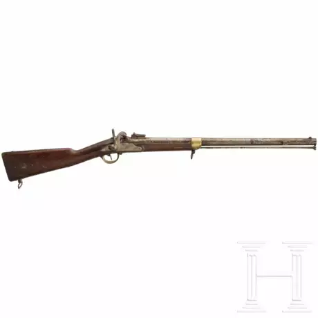 Zunächst oktagonaler, anschließend runder Lauf mit glatter Seele im Kaliber 12,5 mm, rechtsseitige Bajonettaufnahme im Mündungsbereich. Laufoberseite mit einstellbarer Klappkimme, rechtsseitig gemarkt "MI" und "C 1862", linksseitig "C DE 17.6 N" und Seriennummer "1509". Die Schlossplatte signiert "Mre Impale de Châtellerault", darüber Stern/"M". Halbschäftung mit Messinggarnitur und eisernem Ladestock. Sämtliche Teile mit diversen Stempelungen. Ladestock anscheinend nicht zugehörig, Eisenteile etwas rostnarbig. Länge 98,5 cm.